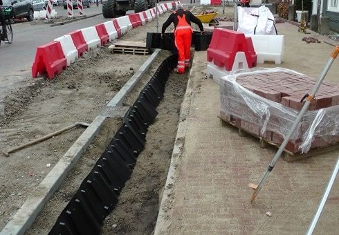 Le RootBarrier® RollRib® est un système innovant en rouleau de guide-racines d’une épaisseur d’1.5mm en PEHD (polyéthylène haute densité). Le RollRib® possède des rainures verticales guidant les racines et est 100% recyclable. Le système est facile et plus rapide à installer que des produits alternatifs de par ses différentes longueurs 12m, 21m et 75m. De plus, le RollRib® est facile à couper à la longueur désirée grâce à la ligne de coupe sur chaque mètre du rouleau. Avec ce système, les racines sont guidées délicatement vers le bas. Comme il a des rainures tous les 18 cm il peut être placé en ligne, en carré ou en rond autour de l’arbre. Le RollRib® RootBarrier® a aussi des ancrages de sol qui empêchent les racines de pousser le RollRib® vers le haut. Les parties de RollRib® sont faciles et rapidement joignables grâce aux vis intégrés.
